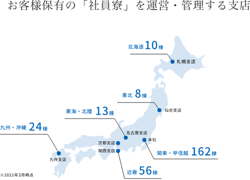全国各地に支店をお持ちの企業様にとって、担当者様が各地の寮を管理するのは大変な手間がかかるもの。地域ごとに異なる業者に管理を依頼すると、サービスの質に差が生じるなど、思うようにいかないことも少なくないようです。